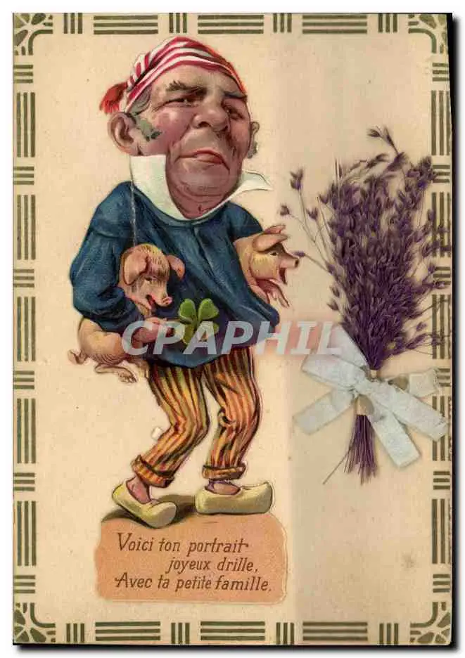 Cartes postales Fantaisie Fleurs Homme Trefle Cochon Porc
