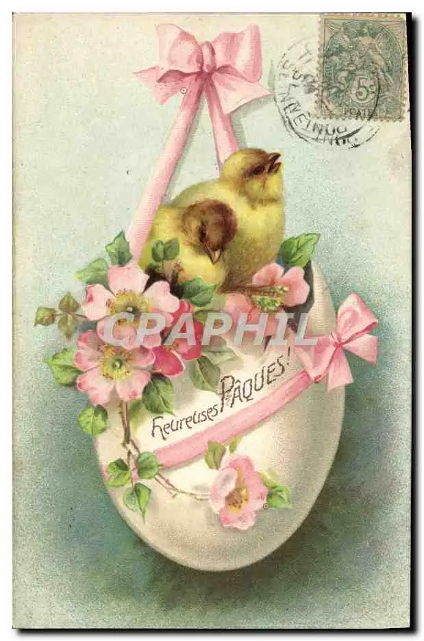 Cartes postales Fantaisie Fleurs Poussins Oeuf Paques
