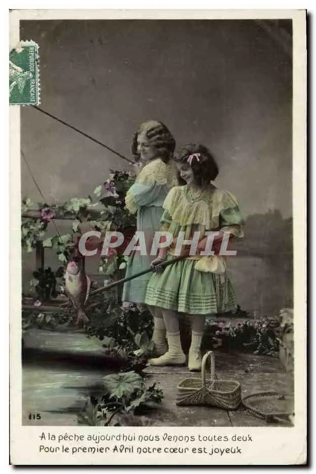 Cartes postales Fantaisie Paques Poisson Enfants Peche