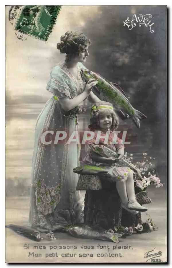 Cartes postales Fantaisie Paques Poisson Femme Enfant 1er Avril