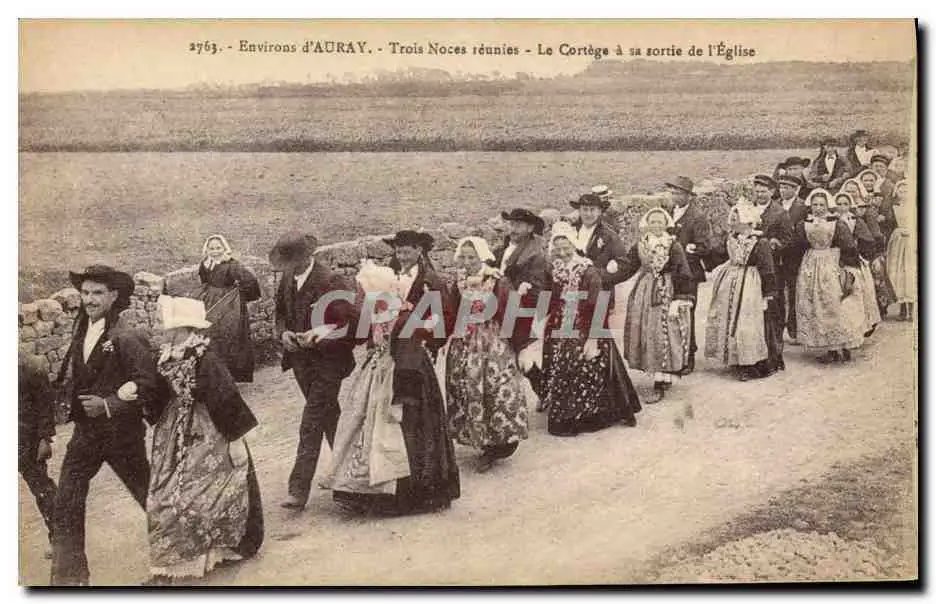 Cartes postales Folklore Environs d'Auray Trois noces reunies Le cortege a sa sortie de l'eglise Mariage