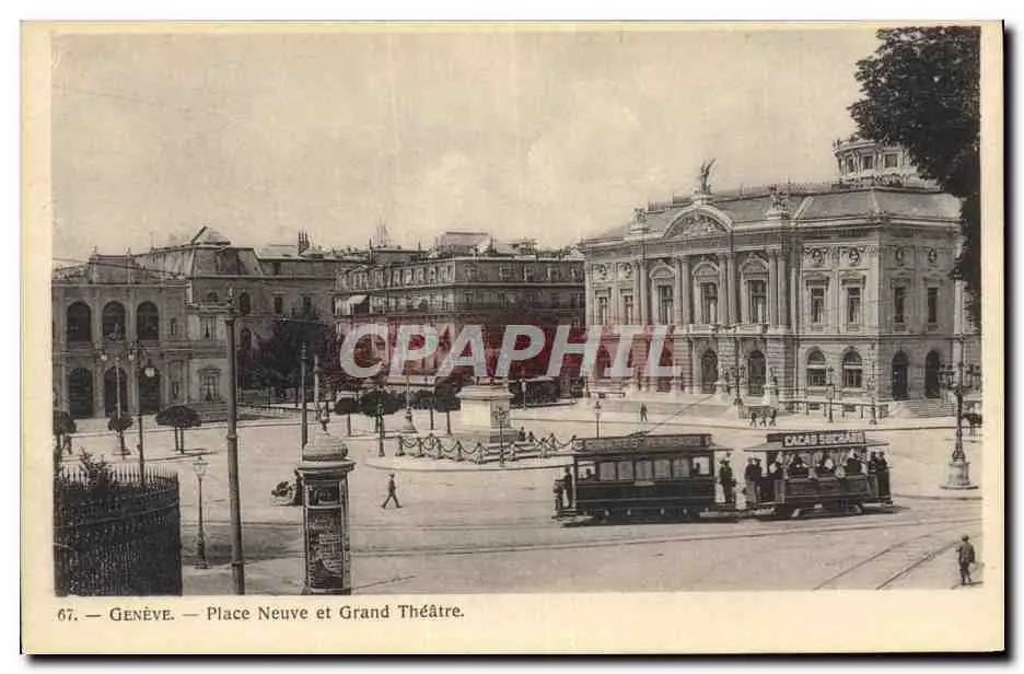 Cartes postales Geneve Place Neuve et theatre Tramway Cacao Suchard