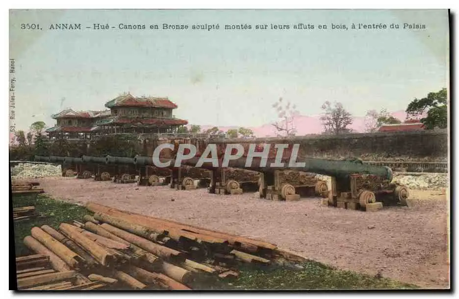 Cartes postales Indochine Annam Hue Canons en bronze sculte montes sur leurs affuts en bois a l'entree du pal