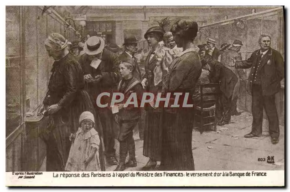 Cartes postales La Reponse Des Parisiens A l'Appel Du Ministre Des Finances Le Versement D'Or a la Banque