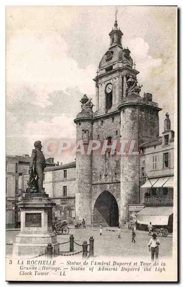 Cartes postales La Rochelle Statue de l amiral Duperre et tour de la Grande Horloge