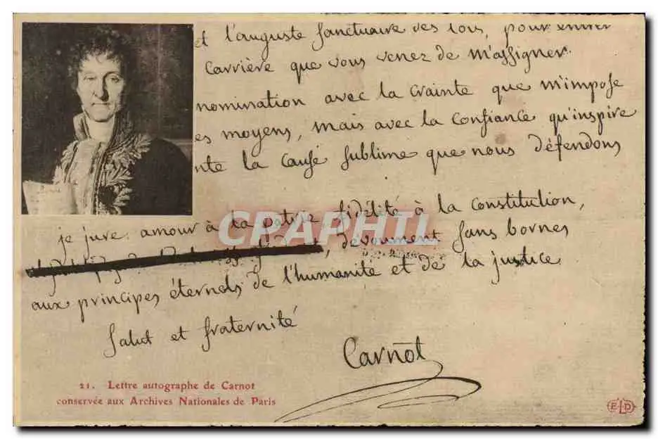 Cartes postales Lettre autographe de Carnot Archives nationales de Paris