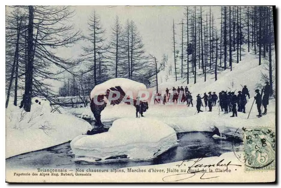 Cartes postales Militaria Brianconnais Nos Chasseurs alpins Marches d&#39hiver Halte au bord de la Clairee