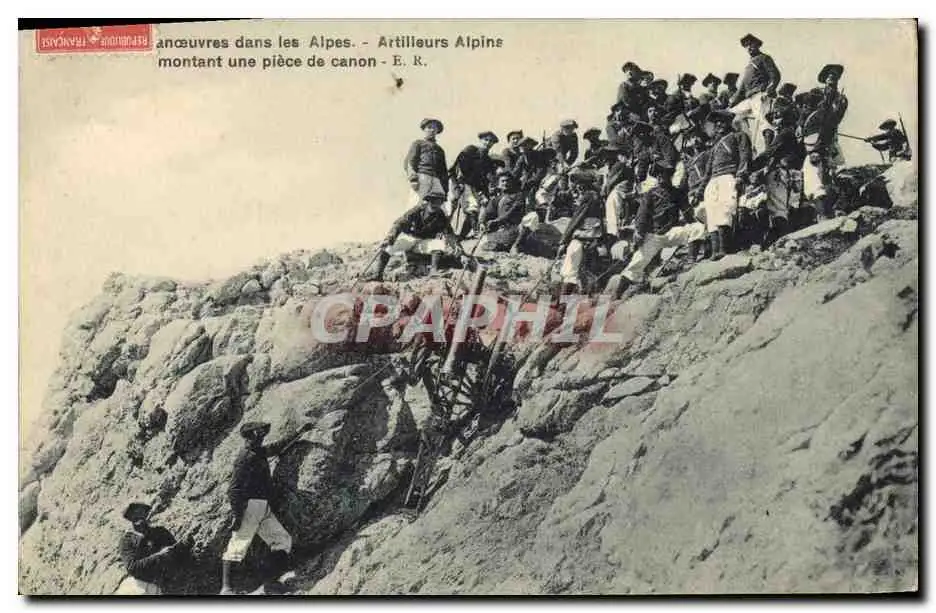 Cartes postales Militaria Chasseurs Alpins Manoeuvres dans les Alpes Artilleurs alpins montant une piece de cano