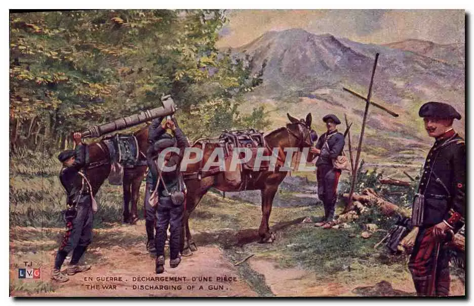 Cartes postales Militaria Dechargement d&#39une piece Chasseurs Alpins Ane Mule