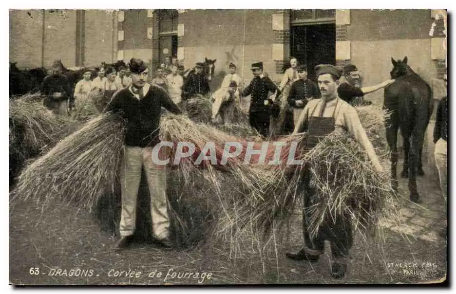 Cartes postales Militaria Dragons Corvee de fourrage Chevaux