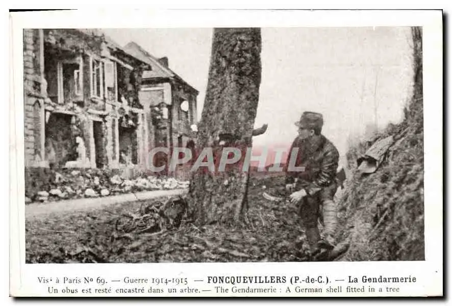Cartes postales Militaria Guerre 1914 1915 Foncquevillers La Gendarmerie Un obus est reste encastre dans un arbr