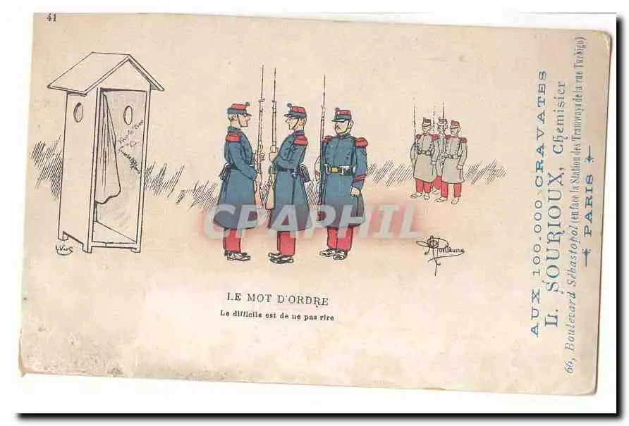 Cartes postales Militaria Le mot d'ordre Le difficile est de na pas rire (soldats) + pub Sourioux Chemisier b