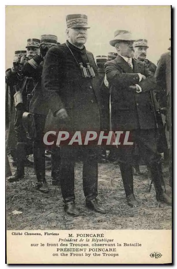 Cartes postales Militaria M Poincare President de la Republique sur le front des troupes observant la bataille