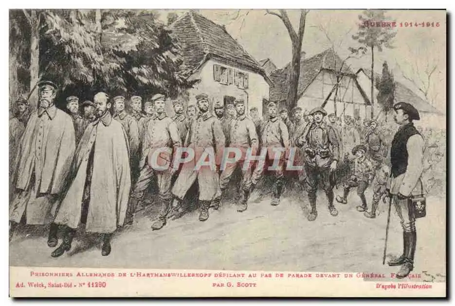 Cartes postales Militaria Prisonniers allemands de l'Hartmanswillerkopf defilant au pas de parade devant un g