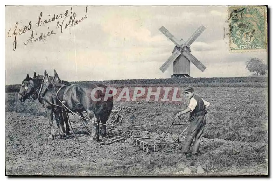 Cartes postales Moulin a vent Laboureur Cheval