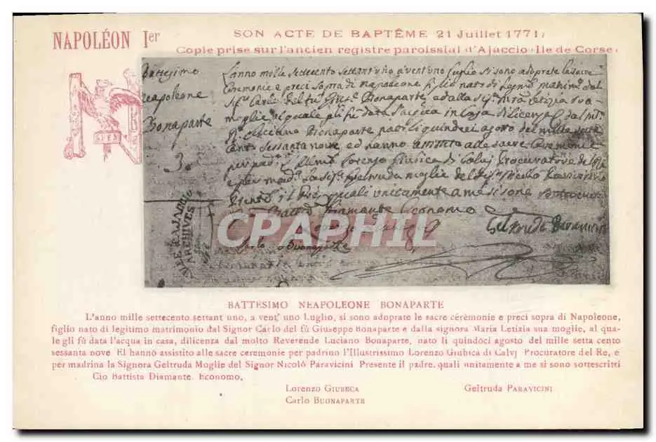 Cartes postales Napoleon 1er Acte de bapteme 21 juillet 1771 Ajaccio Corse