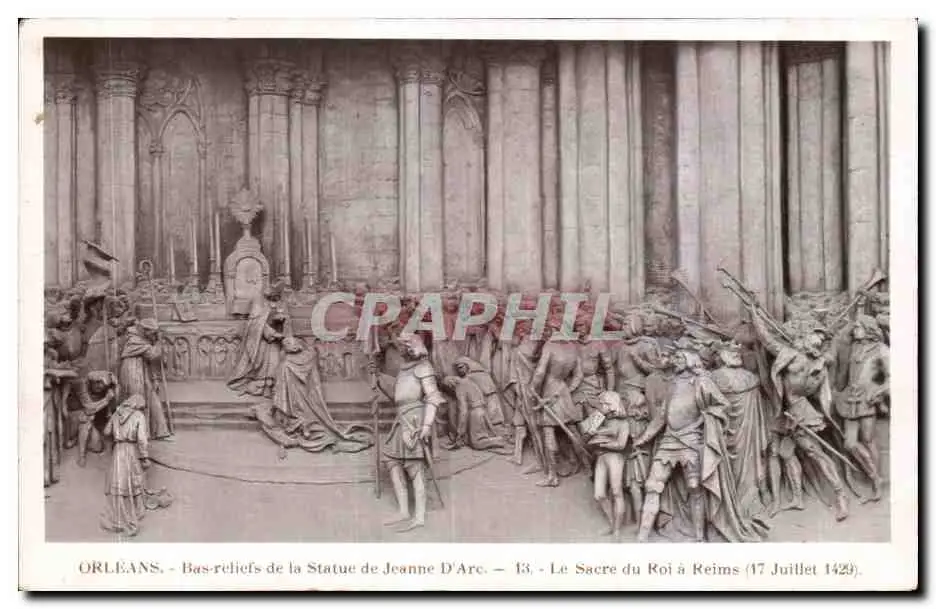 Cartes postales Orleans Bas reliefs de la Statue de Jeanne D Arc Le Sacre du Roj a Reims