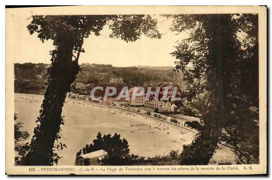 Cartes postales Perros Guirec La Plage de Trestraou vue a travers les arbres de la Montee de la Clarte