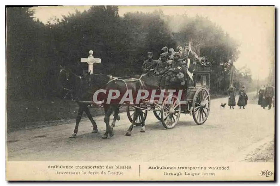 Cartes postales Sante Militaria Ambulance transportant des blesses traversant la foret de Langue