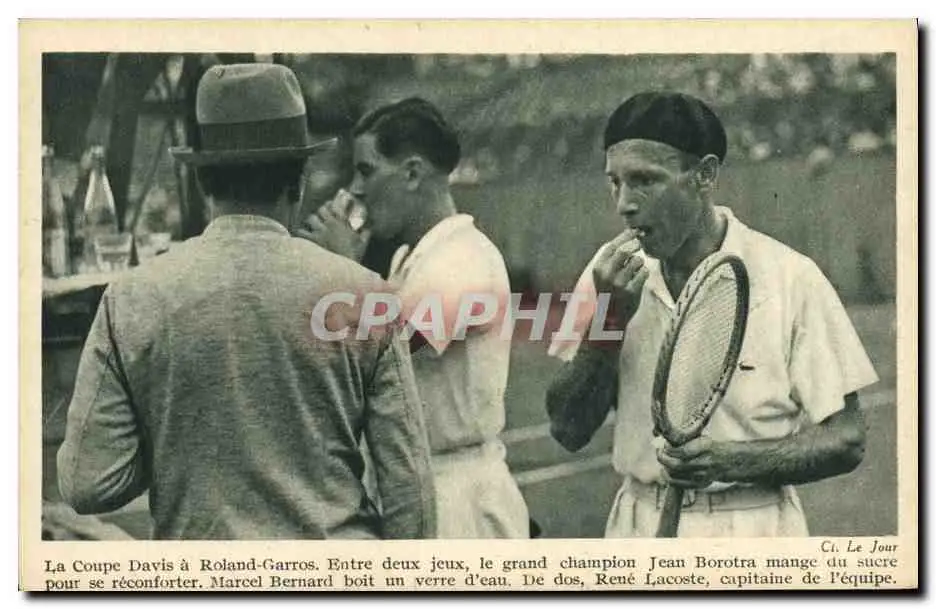 Cartes postales Tennis La Coupe Davis a Roland-Garros Jean Borotra mange du sucre Rene Lacoste Marcel Bernard