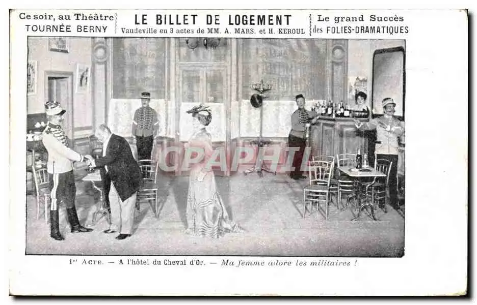 Cartes postales Theatre Le billet de logement Mars Keroul Tournee Berny A l'hotel du Cheval d'or