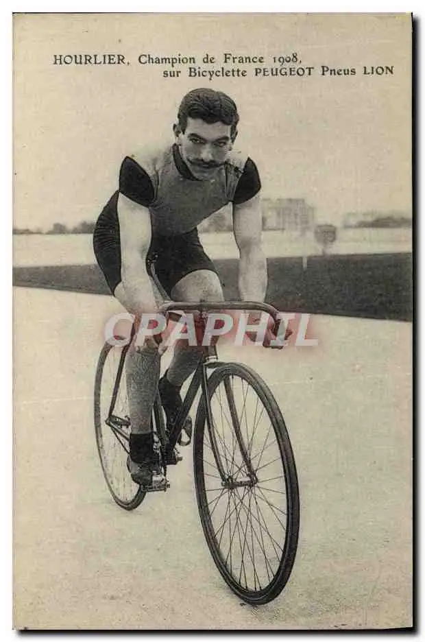 Cartes postales Velo Cycle Cyclisme Hourlier Champion de France 1908 sur bicyclette Peugeot Pneus Lion