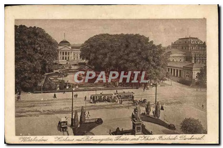 Cartes postales Wiesbaden Kursaal avec jardin theatre et sttue de l&#39empereur Frederic