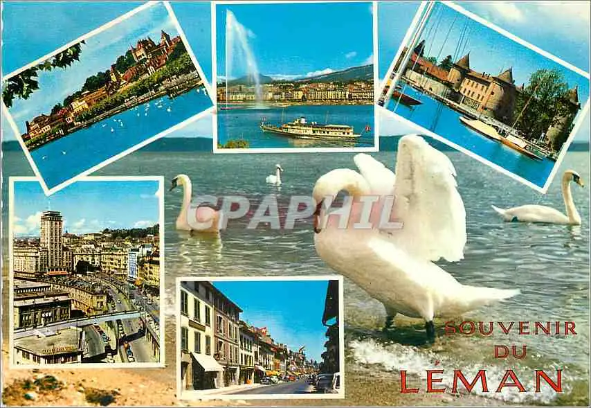 Cartes postales moderne Lac Leman Nyon le port et le chateau geneve le jet d'eau 130 m et le mont blanc 4810 m