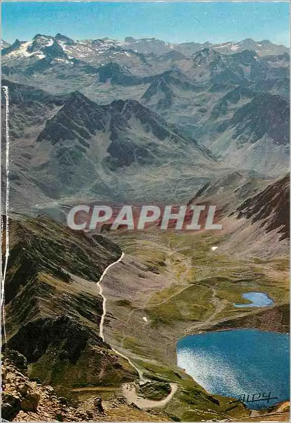 Cartes postales moderne Le Col de Sencours et le Lac d'Oncet vus de la Route du Pic du Midi Les Pyrenees Au fond le Mass