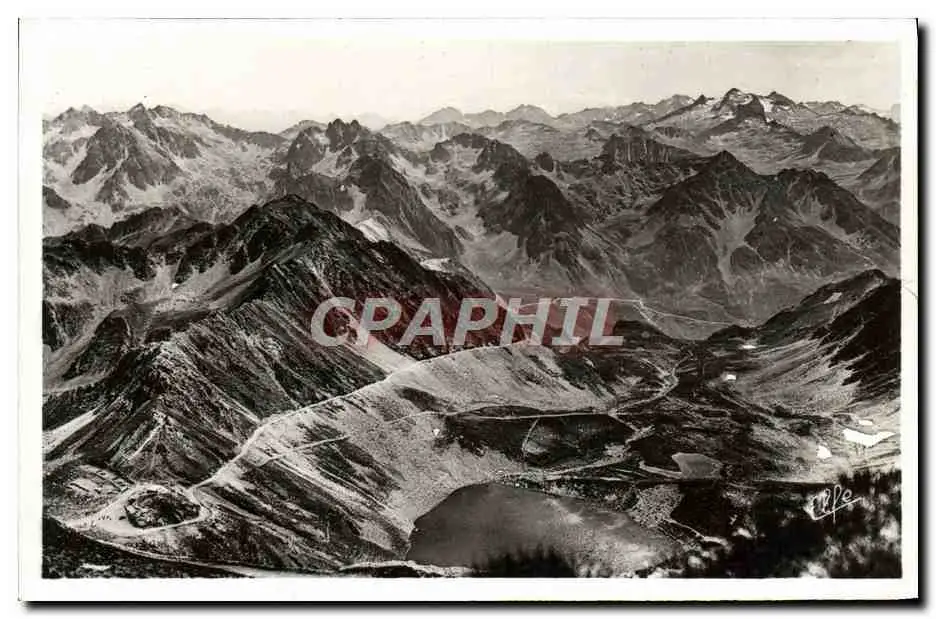 Cartes postales moderne Le Pic du Midi Panorama pris du terminus de la route a 2640m En bas Col de Sencours et Lac d'