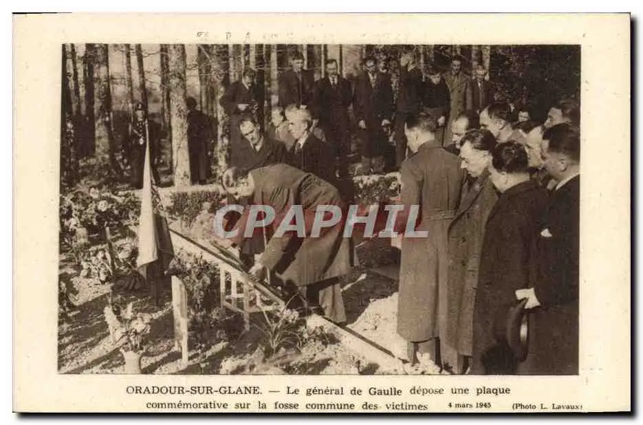 Cartes postales moderne Militaria Oradour sur Glane Le Generale de Gaulle depose une plaque commemorative sur la fosse c