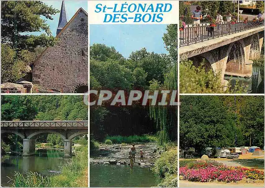 Cartes postales moderne Saint Leonard des Bois (Sarthe) L'Eglise Baignade dans un Gue Le Pont sur la Sarthe et Camping