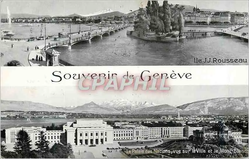 Cartes postales moderne Souvenir de Geneve Ile JJ Rousseau Le palais des Nations vue sur la ville et le Mont Blanc