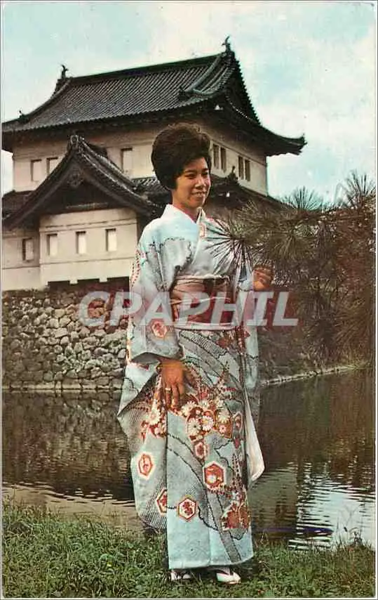 Cartes postales moderne Traditional Japanese dress and part of the Imperial Palace and moat in Tokyo Qantas