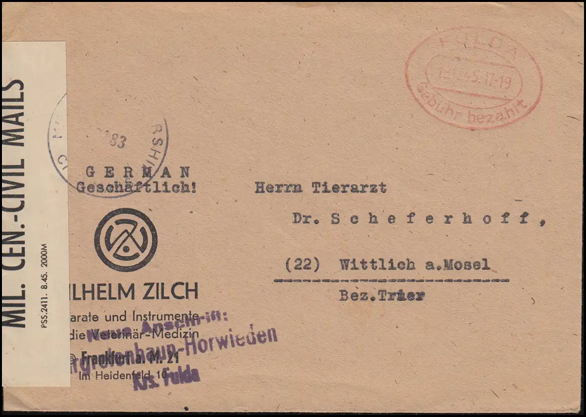 Cennorship CIVIL avec frais payés temple FULDA 12.12.1945 sur lettre