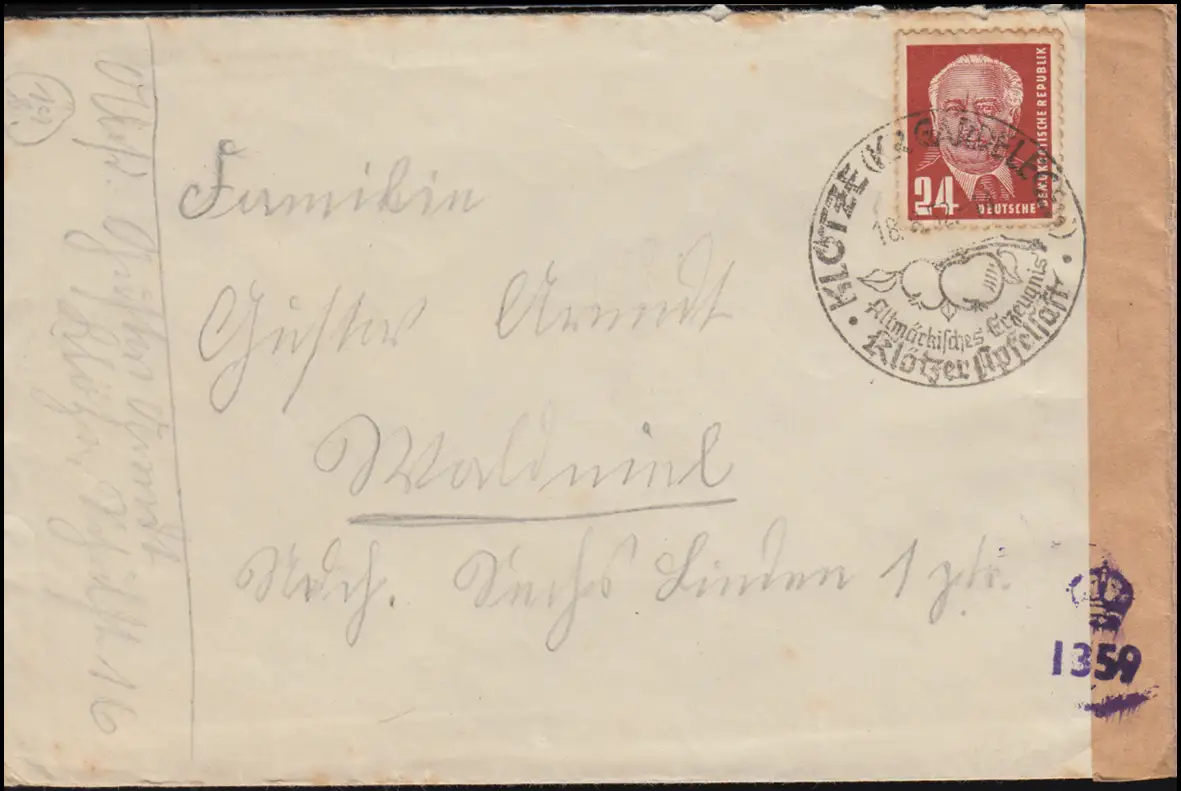 Censure 1359 sur lettre 324 Pieck EF SSt KLÖTZE Jus de pomme 18.8.52 à Waldniel