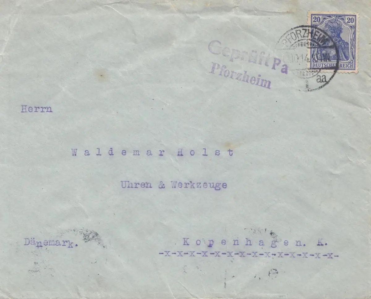 Censure: 1914 Lettre de Pforzheim à Copenhague-Examen Pa P Forzhem
