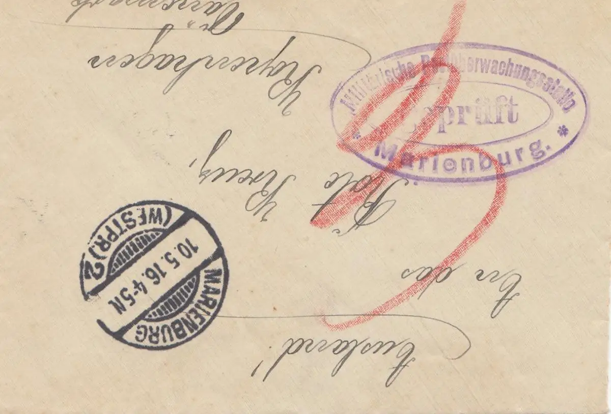 Censure: 1916: Marienburg vers Danemark: Postsichtung Marienburg
