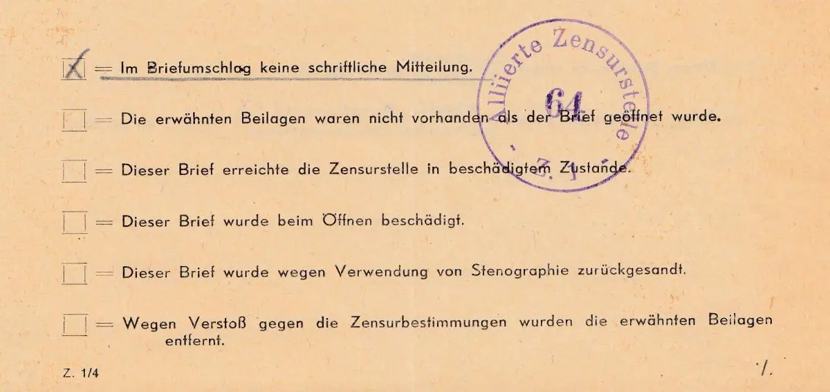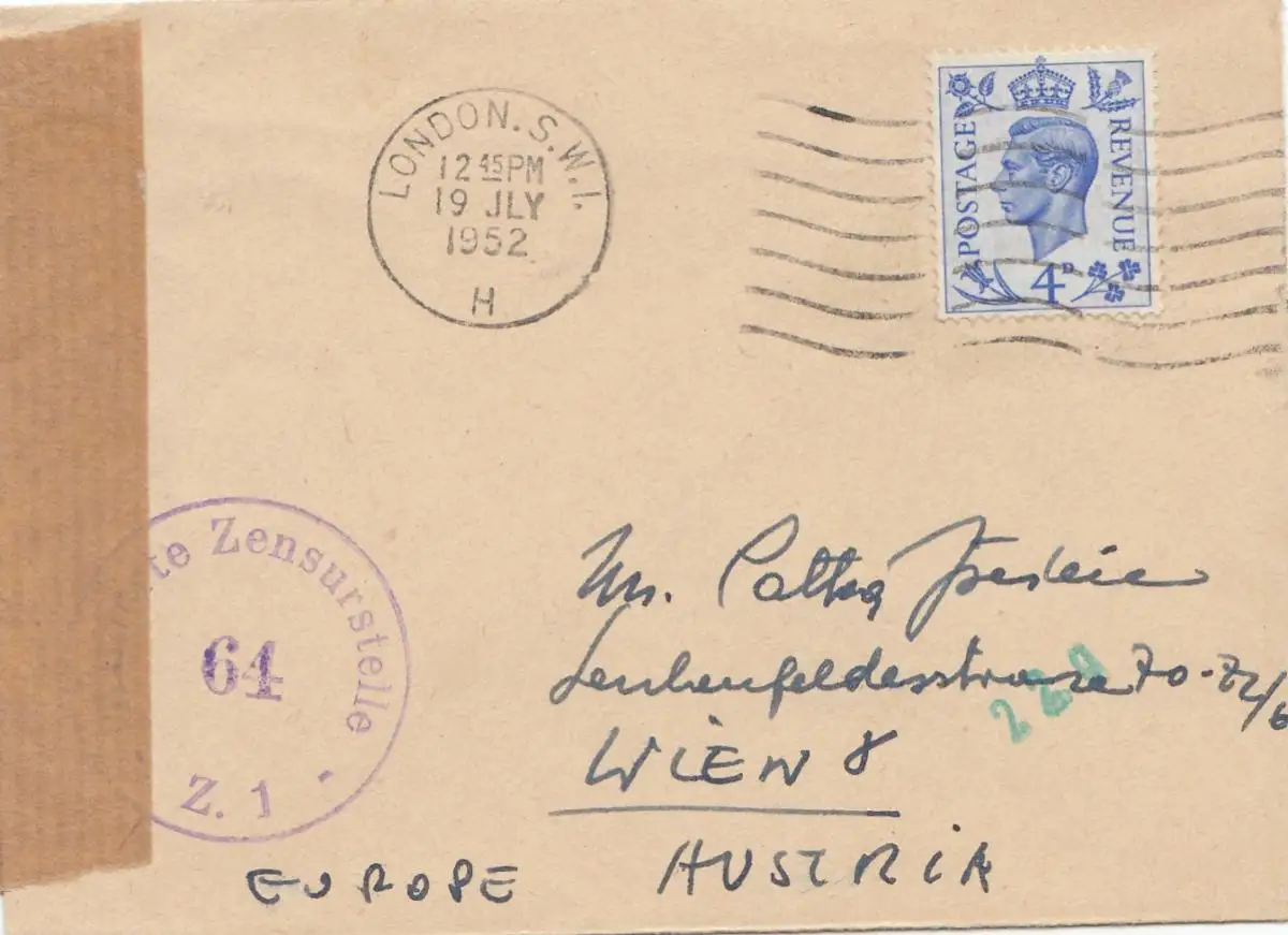 Censure: 1952: Lettre de Londres à Vienne: Censuration alliée 64