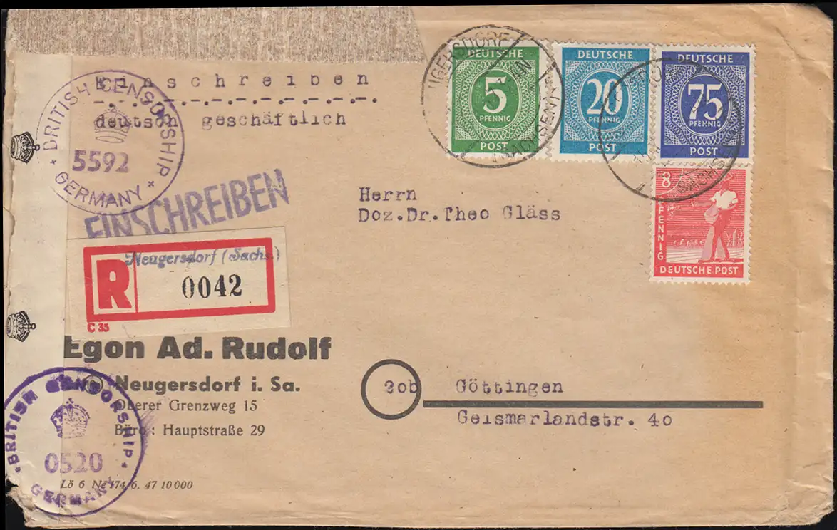 Censure British Censorship 5592 et 0520 R-Lettre NEUGERSDORF (SACHS.) 15.10.47