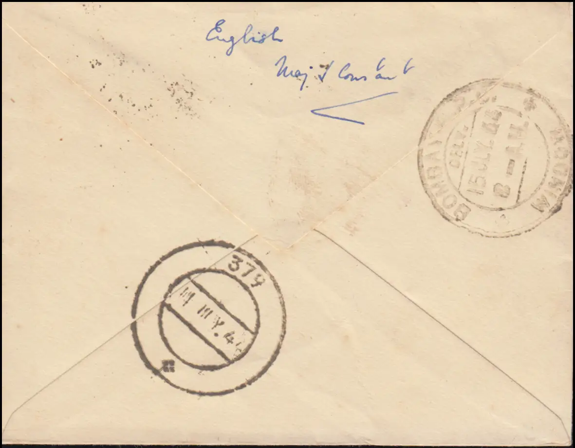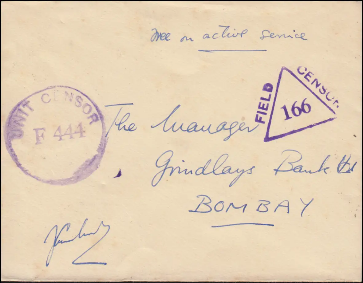 Censure UNIT CENSOR F 444 - Poste de terrain Inde FIELD CENSOR 166 selon BOMBAY 15.7.44