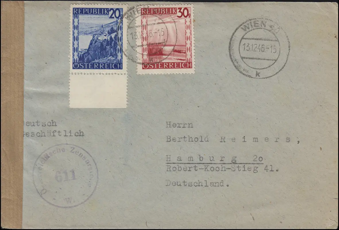 Censure autrichienne 611 W, lettre 750+753 MiF WIENNE 13.12.1946 n. Hambourg