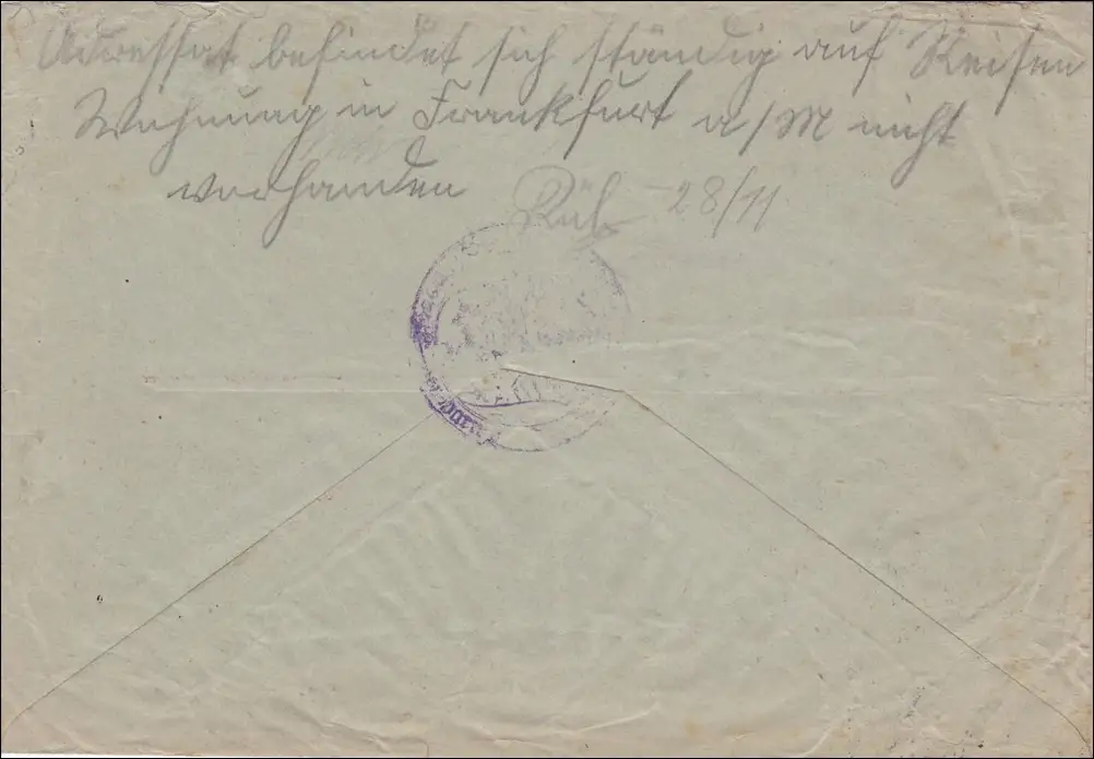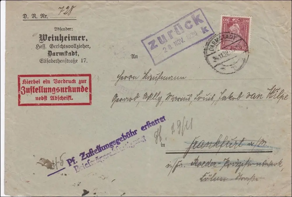 Certificat de notification Darmstadt vers Francfort 1928: REMBOURSEMENT REQUIS !!!