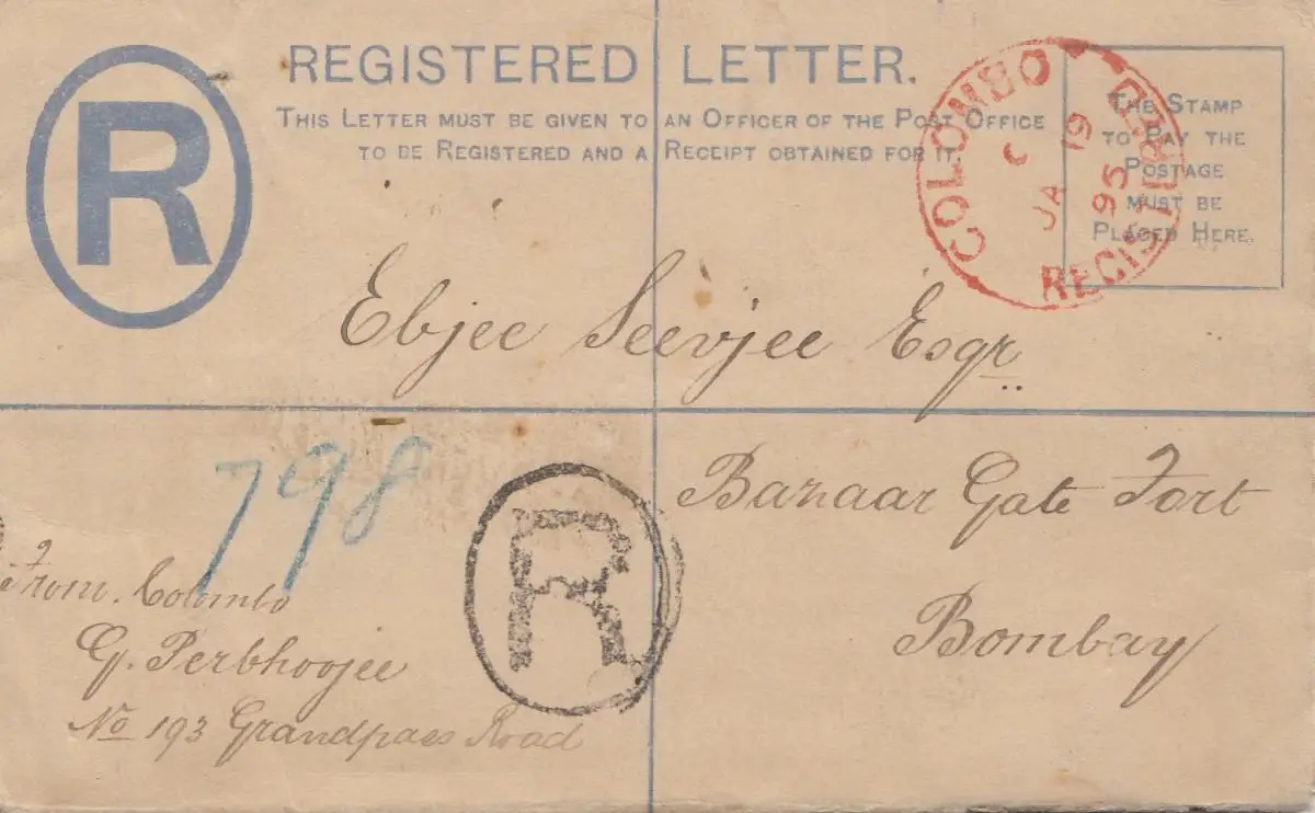Ceylan 1895: Registered letter Colombo to Bombay/India