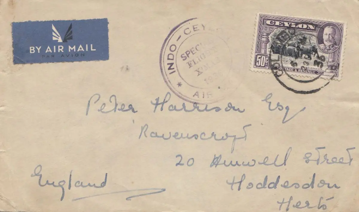 Ceylan: 1936: Indo-Ceylon Special Flight X'mas from Colombo to Hodderson/Angleterre