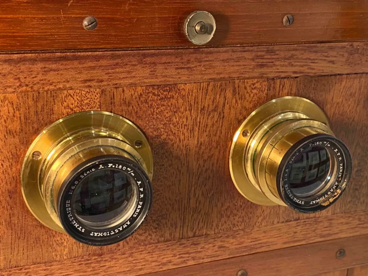 Appareil photographique stéréoscopique ancien de collection en bois, format 18 x 24cm, soufflet noir avec renforts en cuir bordeaux. Objectifs anastigmat A.F.R. Paris,180 mm f/6,8.