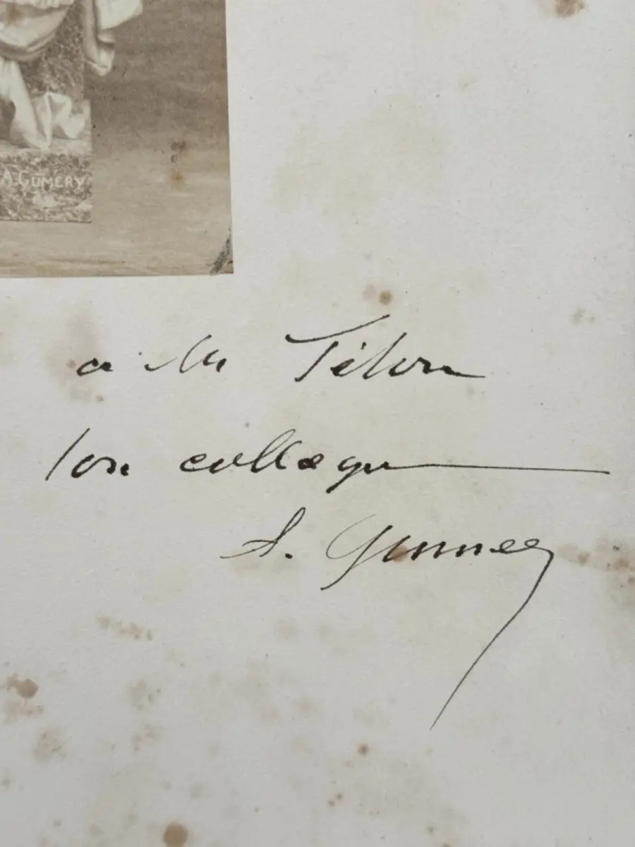 Le sculpteur a dédicacé l'épreuve sur le carton de montage, en précédant sa signature de la mention «à M. Félon son collègue"(Joseph Félon, peintre et sculpteur (1818-1897)). La sculpture porte le numéro de salon 3282.