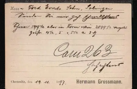 Chemnitz. Herrmann Grossmann. Keine AK!! - Gebraucht. 1897. (NPLZ 09100)