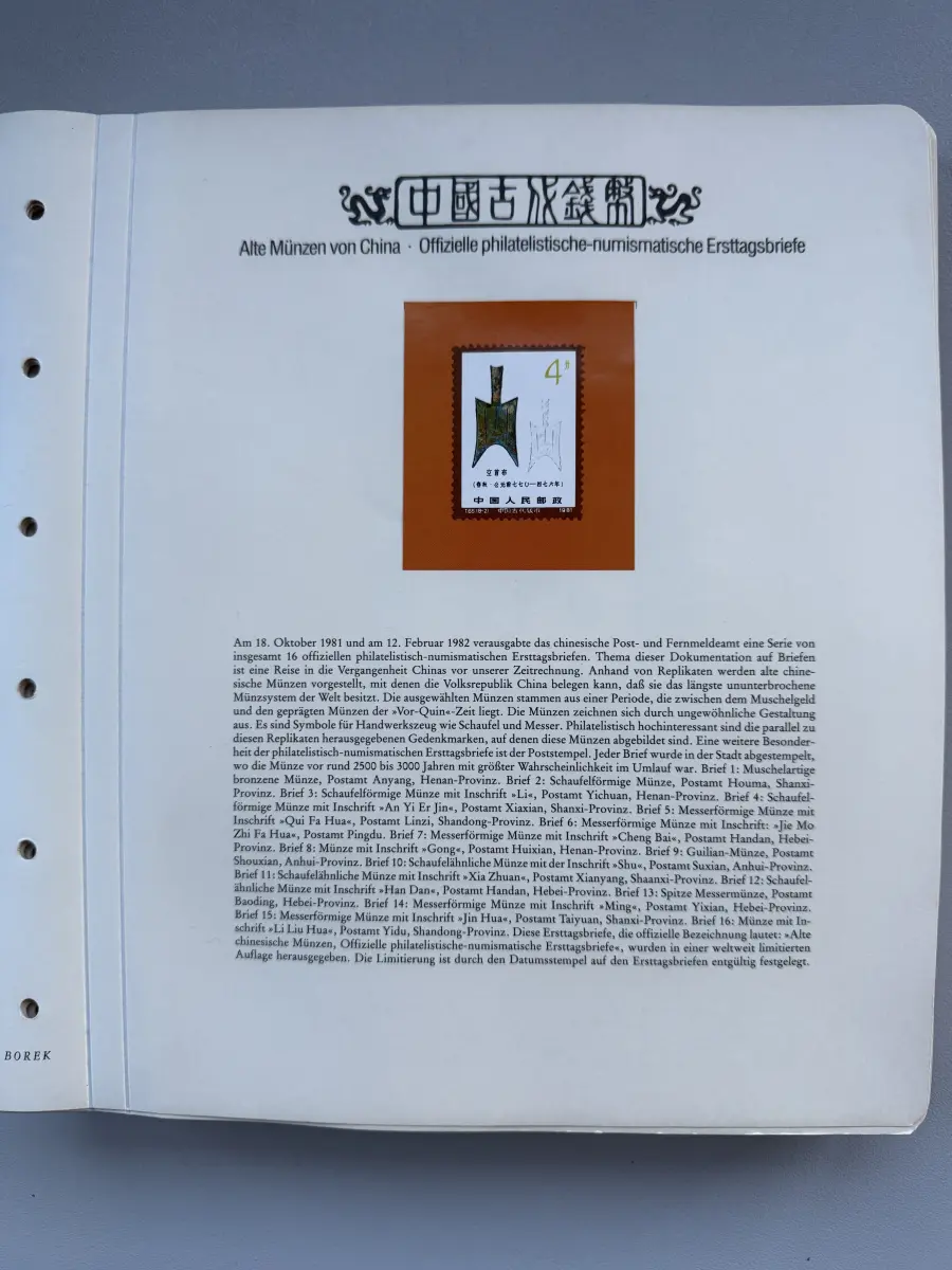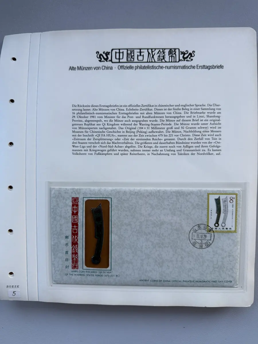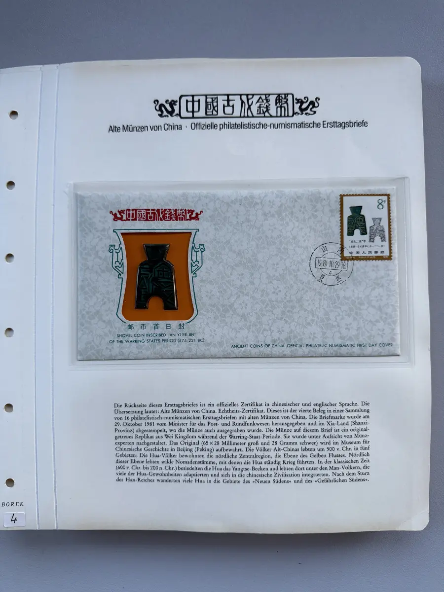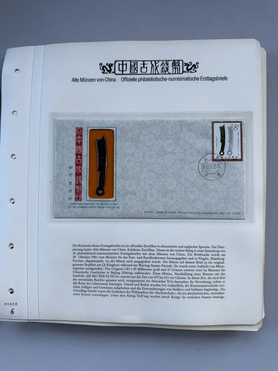 Offizielle philatelistische-numismatische Ersttagsbriefe / Numisbriefe der Volksrepublik China (Agentur Borek) von Ende 1981. Die limitierte komplette Sammlung ist auf reich illustrierten Vordruckblättern aufgezogen und beinhaltet unter anderem 16 + 3 Numisbriefe. Die einzelnen Briefe zeigen eine genaue Herkunftsbeschreibung, geben Fundort, Zeit und andere wichtige Infos an. Sie sind mit einem offiziellen Ersttagsstempel aus der Stadt, in der die Münze ausgegraben wurde, versehen. Die jeweilige Münze ist vom Motiv her identisch mit dem Motiv der aufgeklebten Briefmarke. Jede Münze ist sowohl vorderseitig als auch rückseitig sichtbar. Der Abopreis war gigantisch.