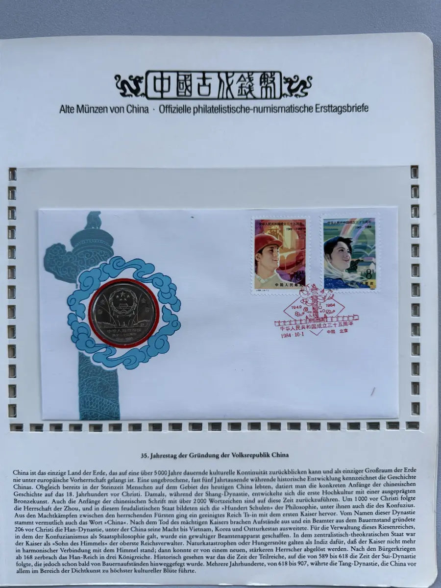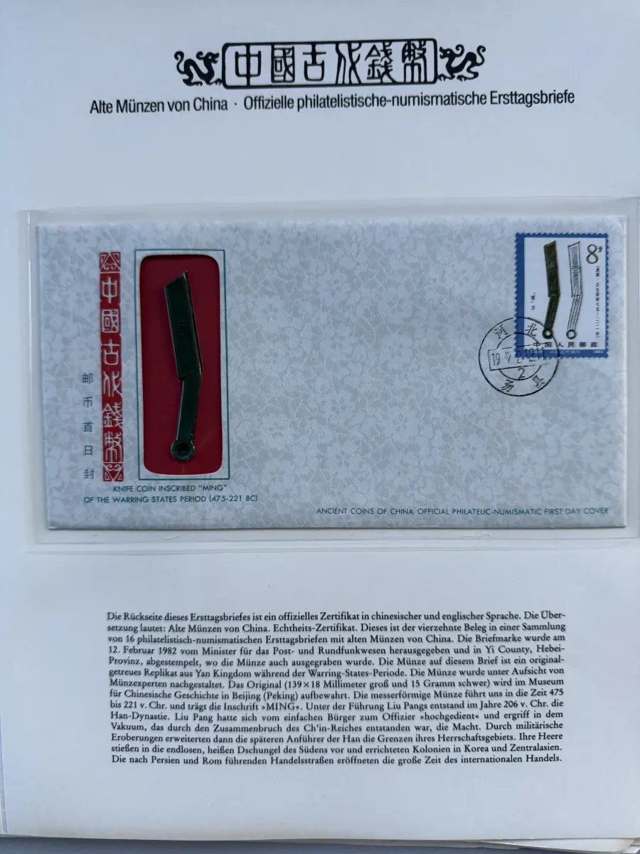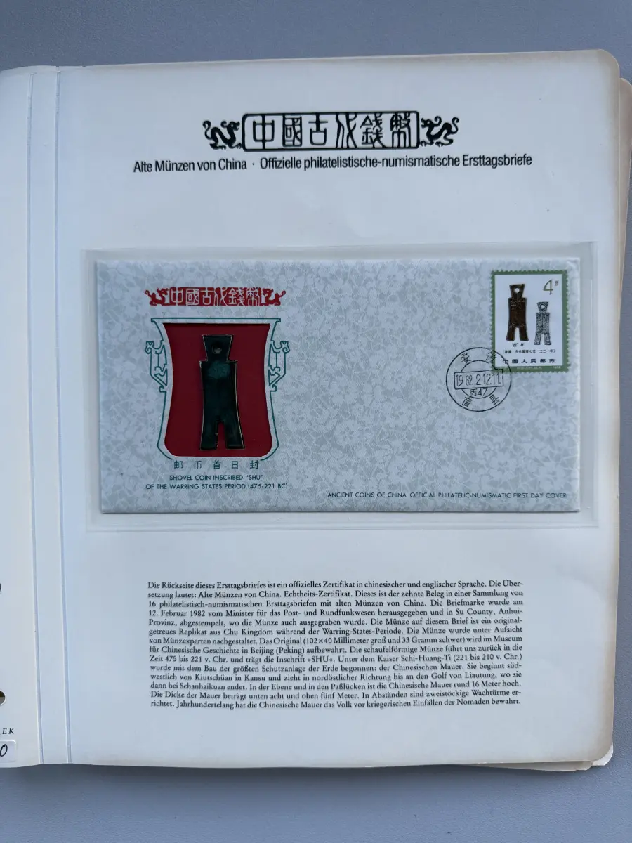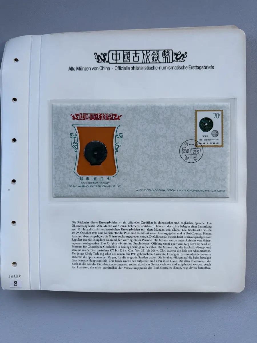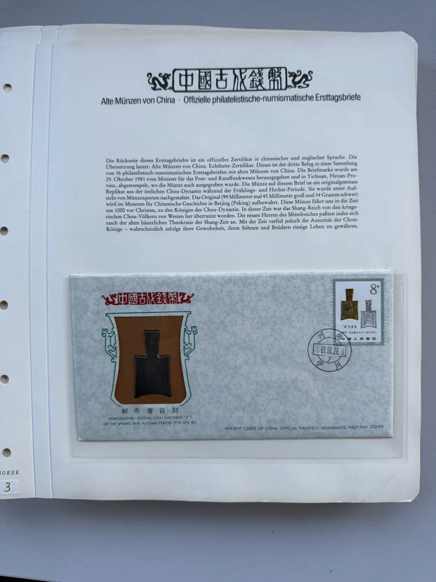 Offizielle philatelistische-numismatische Ersttagsbriefe / Numisbriefe der Volksrepublik China (Agentur Borek) von Ende 1981. Die limitierte komplette Sammlung ist auf reich illustrierten Vordruckblättern aufgezogen und beinhaltet unter anderem 16 + 3 Numisbriefe. Die einzelnen Briefe zeigen eine genaue Herkunftsbeschreibung, geben Fundort, Zeit und andere wichtige Infos an. Sie sind mit einem offiziellen Ersttagsstempel aus der Stadt, in der die Münze ausgegraben wurde, versehen. Die jeweilige Münze ist vom Motiv her identisch mit dem Motiv der aufgeklebten Briefmarke. Jede Münze ist sowohl vorderseitig als auch rückseitig sichtbar. Der Abopreis war gigantisch.